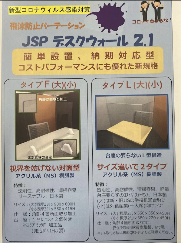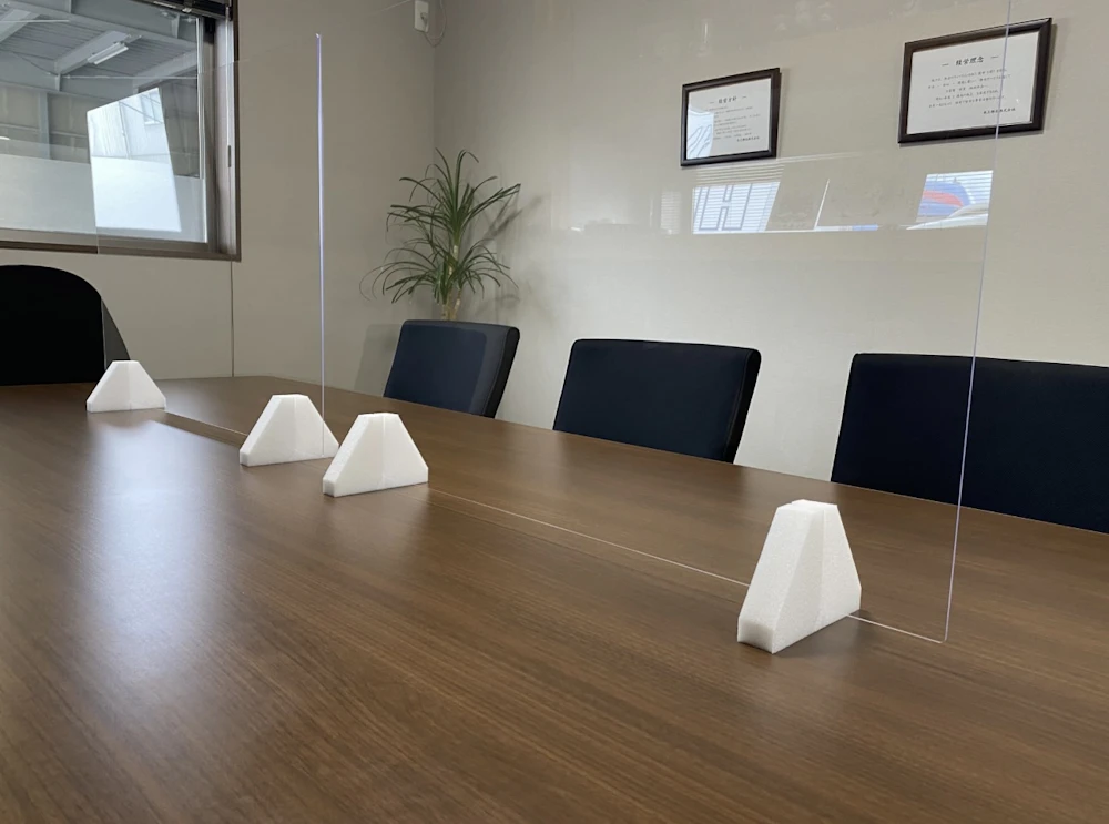 本日、感染対策としまして弊社お得意様(株)JSP様より飛沫防止パーテーション(JSPデスクウォール2.1 タイプF(大))を購入し、応接室に設置いたしました。